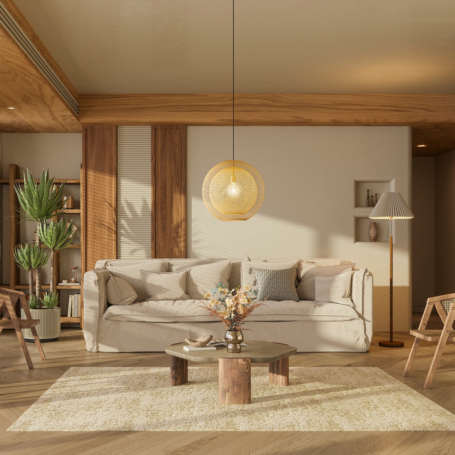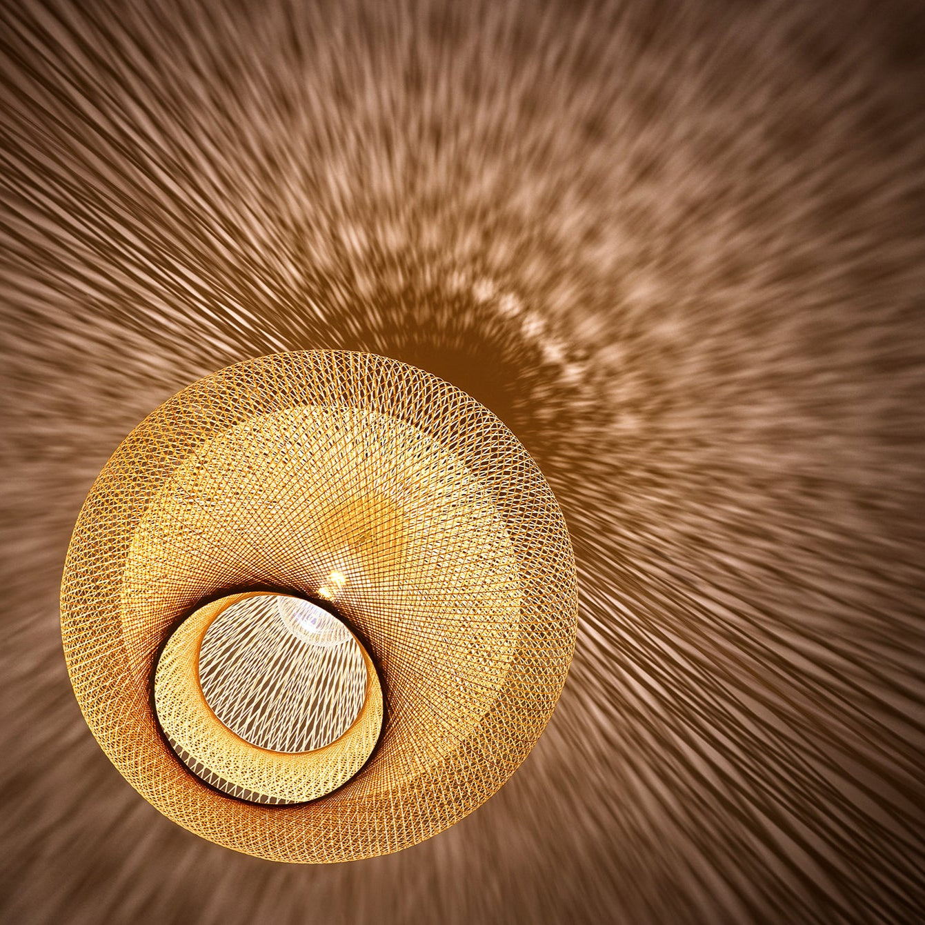 均等に巻かれた糸のシェードからこぼれる光は、風に揺れる葉の隙間から差し込む陽のように、やわらかく、ふんわりと空間を包み込みます。